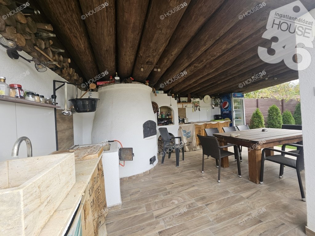 -burkolt 26 m2-es terasz, 12 m2-es melléképület + sütögető, bográcsozó, épített kemence