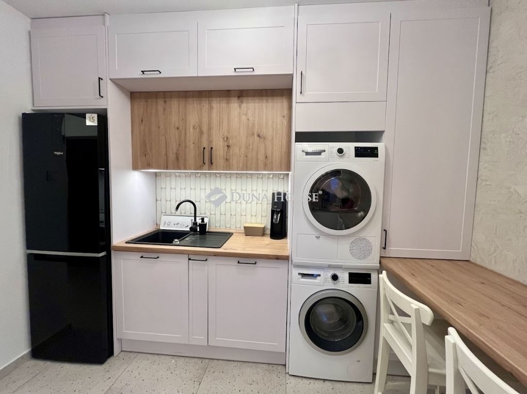 - teljesen gépesített konyha, egyedi gyártású, festett fa frontos konyhabútor, minőségi szerelvényekkel,