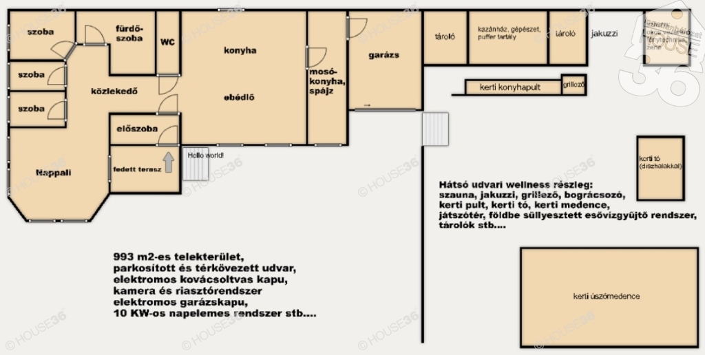 Jellemzők: közel 200 m2-es lakóterület, tégla falazat, 15 KW-os napelemes (szaldós) rendszer, 3 x 32 A, padlófűtésrendszer, gázkazán puffertartállyal, klímaberendezések (3 db), riasztórendszer, kamerarendszer, kovácsoltvas elektromos kapu, elektromos garázskapu, parkosított és térkövezett udvar, fedett terasz, nagyméretű (okos) 12 személyes szauna, 6 személyes jakuzzi, kerti pult és sütögető, kerti tó (díszhalakkal), fürdőtó, földbe süllyesztett esővízgyűjtő rendszer, melléképületek stb. (A vételár részét képezi a teljes bútorzat is.)