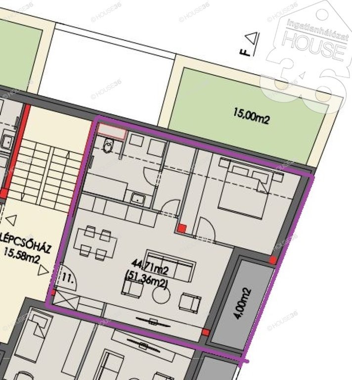 Az épület első emeletén, bruttó 51,36 m2, nettó 44,71 m2 lakóterű, nappali + 1 szobás lakás, 4 m2 erkéllyel megvásárolható, mely külön lépcsőházból elérhető ahol nincs lift.