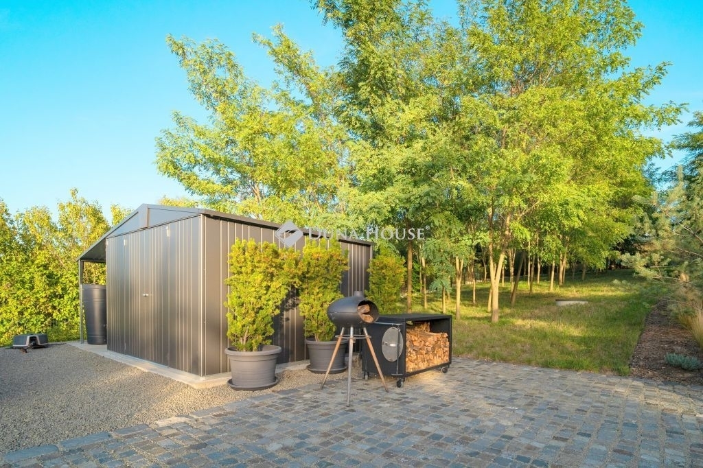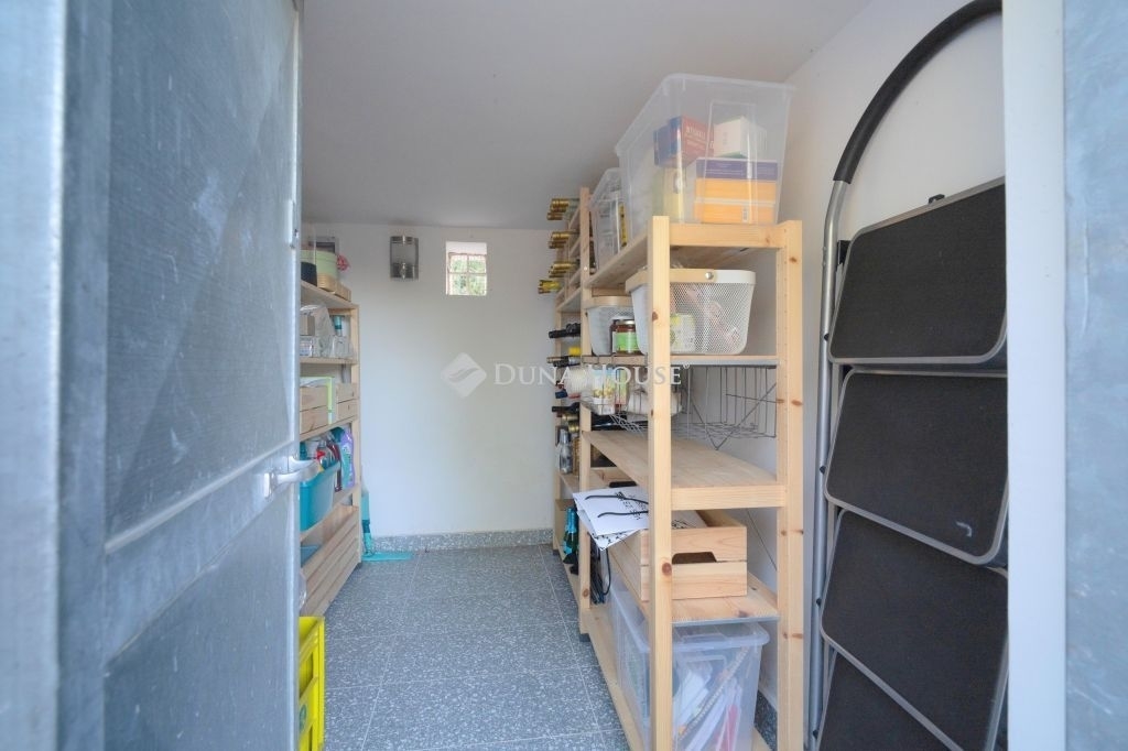 A kertérszkedéshez, műveléshez, illetve háztartáshoz szükséges dolgok tárolása a házikó alatti száraz szuterénhelyiségben, illetve a közelében elhelyezett, szintén újszerű, mobil tárolóházban is megoldott.