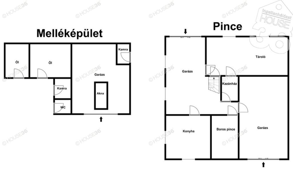 Egész épület alatt szuterén, garázzsal, konyhával, tárolókkal