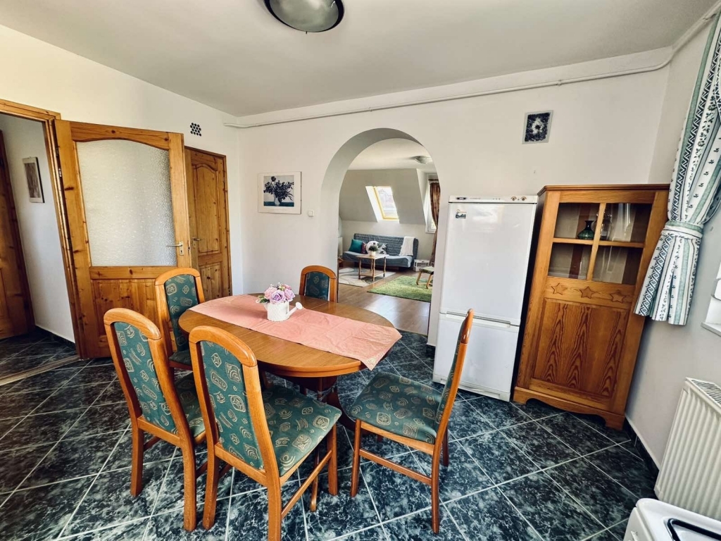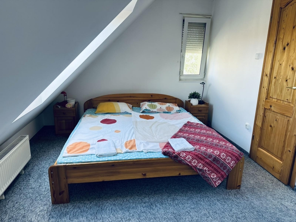 * Kényelmes elosztás: konyha-étkező, nappali, fürdő és WC, spájz, előtér a földszinten, valamint egy hálószoba és külön WC a tetőtérben.