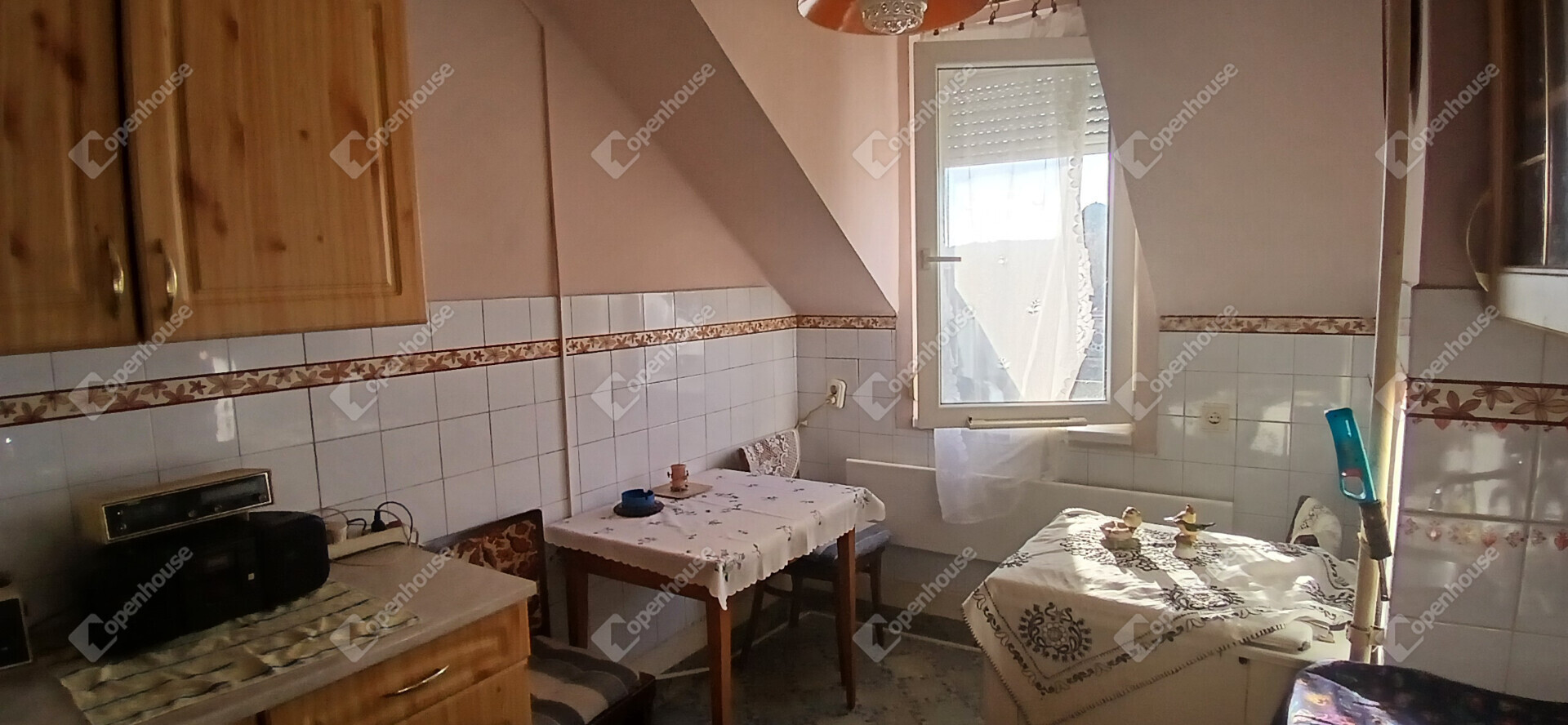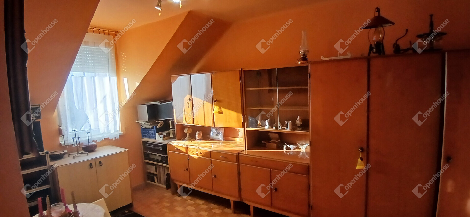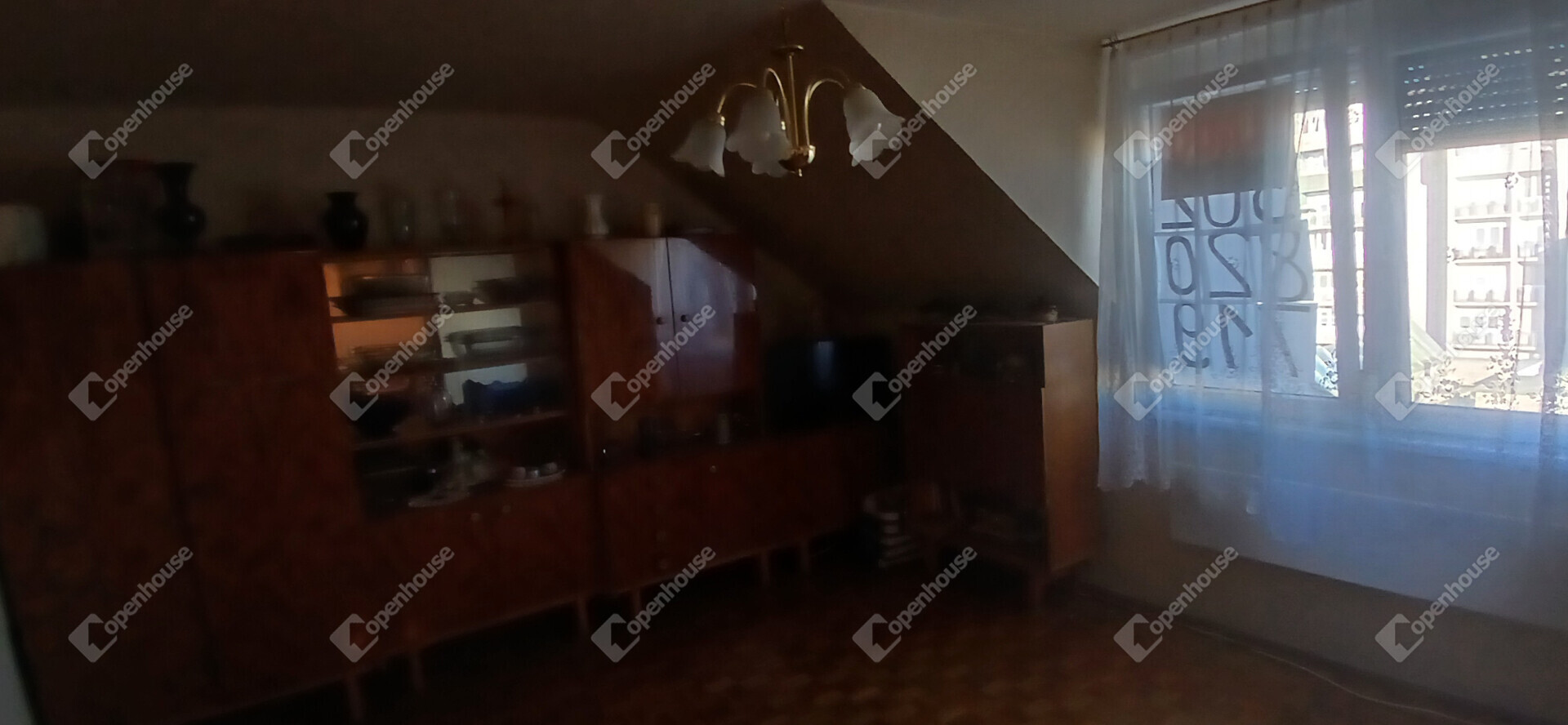 A tetőtéri, 56 m²-es ingatlan jelenlegi elrendezésében 2 szobás, étkezővel, konyhával, közlekedővel, kis kamrával és fürdőszobával (WC-vel együtt) rendelkezik. Az alaprajz jól alakítható, így igény szerint 1+2 félszobás lakás is kialakítható belőle.