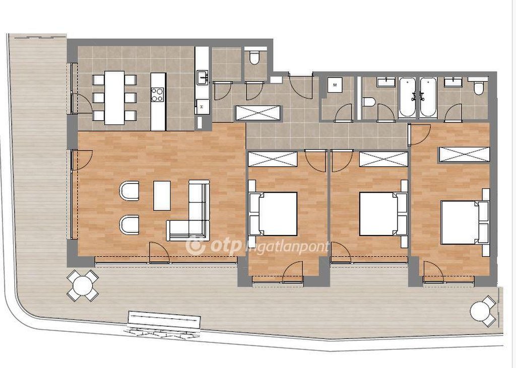 Helyiségek: előtér 10,47 m2, nappali + étkező 38,22 m2, konyha 18,93 m2, fürdők 4,05/5,13 m2, wc 1,45 m2, háztartási h. 2,25 m2, szobák 16,78/14,05/20,4 m2, terasz 66,79 m2.