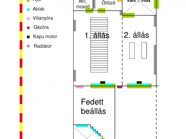 2db motoros szekcionált garázskapuval rendelkezik. Iroda és/vagy öltözőhelység. Wc, zuhanyzó, kézmosó. Központi fűtés radiátorokkal, termosztáttal. Kiépített levegőrendszer. Egyedi almérős gáz és villany 230/400V villamos érintésvédelemmel. 3,5kW-os hűtő-fűtő légkondicionáló.