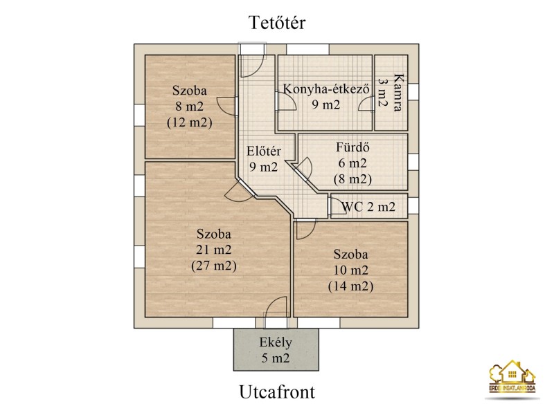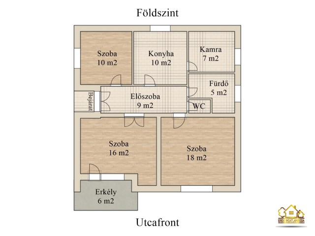 Mindkét lakószinten 3 szoba, konyha-étkező, kamra, fürdőszoba, külön WC és előszoba kapott helyet.