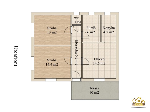 Kialakításra került 2 szoba, konyha, étkező, fürdőszoba, külön WC és előszoba, melyhez kapcsolódik egy 10 m²-es fedett terasz is. Tetőtere igény esetén beépíthető.