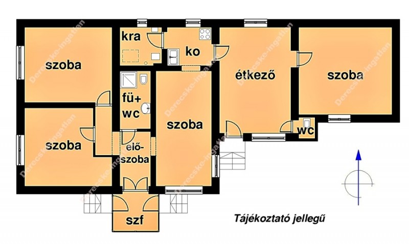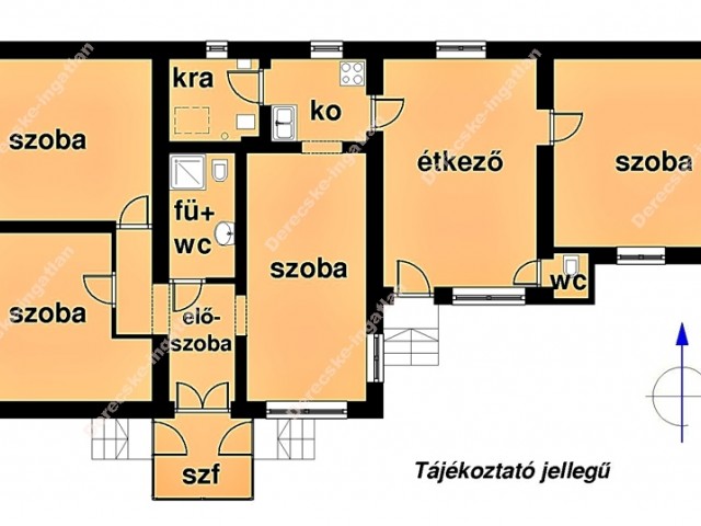 Tájolás: 4 irányba, 1 utcára és az udvarra tájolt. Nappali szoba keleti és déli, étkező és hátsó szoba déli, az utcai hálók nyugati tájolásúak.