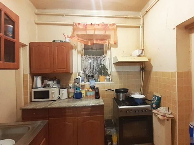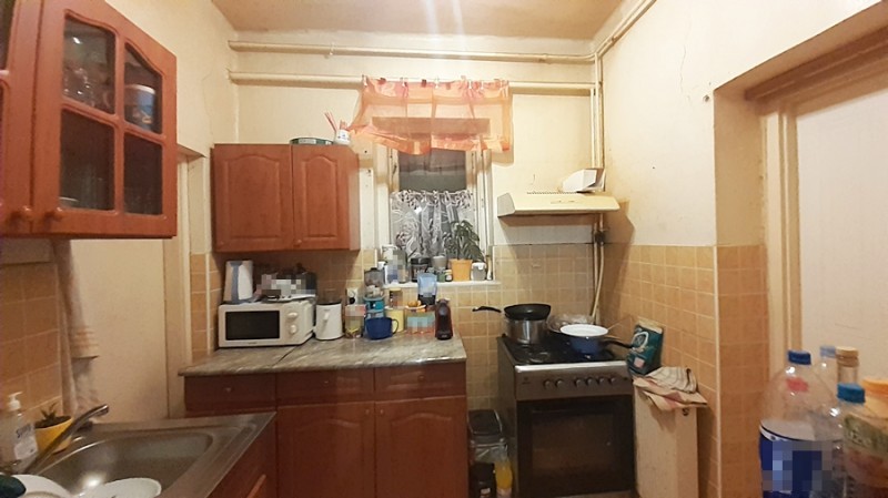 Konyhai berendezések (maradók): szekrények, falipolcok, 2 medencés mosogató, gáztűzhely sütővel
