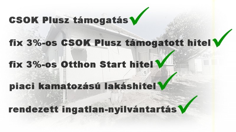 CSOK Plusz támogatás, fix 3%-os CSOK Plusz államilag támogatott hitel, a fix 3%-os Otthon Start államilag támogatott hitel, és a piaci kamatozású lakáshitel feltételeinek megfelelő ingatlan! CSOK Plusz esetén illetékmentesség! Energetikai pályázati lehetőség! Teljesen rendezett földhivatali ingatlan-nyilvántartás!