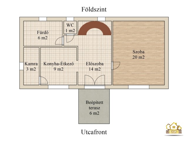 A földszint 53 m²-es, egy szoba, konyha-étkező, kamra, fürdőszoba, külön WC és előszoba került kialakításra, a bejárathoz egy 6 m²-es beépített terasz kapcsolódik.