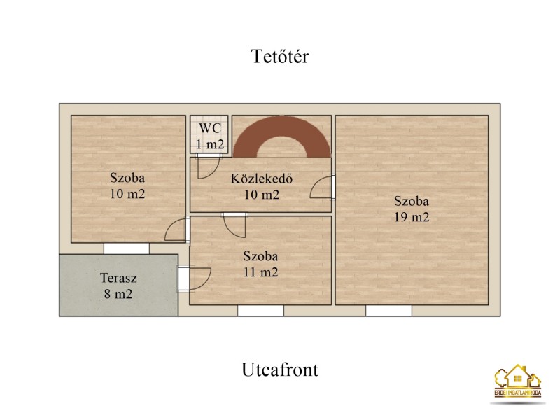 A tetőtér 51 m²-es, 3 szoba, külön WC, közlekedő és egy 8 m²-es emeleti terasz kapott itt helyet.