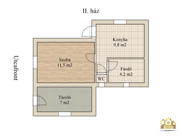 A II. ház téglaépítésű, 33 m²-es, konyha, 1 egész szoba, fürdőszoba, külön WC és egy külső tároló kapott helyet.