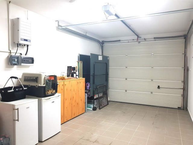 A ház minden részlete igényesen megválasztott burkolatokkal, modern szerelvényekkel és átgondolt elosztással készült. Az elektromos redőnyök, a riasztó- és kamerarendszer, valamint az elektromos kapu mind a kényelmet és a biztonságot szolgálják. A fűtött garázs és a fedett gépkocsibeálló praktikus megoldást kínál a mindennapokra.