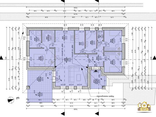 A lakás belső elrendezése rendkívül praktikus és kényelmes. A hálószobák száma 3, az egyik hálószobához fürdőszoba és egy gardróbszoba kapcsolódik. A tágas amerikai konyhás nappaliból egy 20 m2-es fedett teraszra jutunk. A további 2 hálószoba a külön WC helyiség, a háztartási helyiség és a fürdőszoba közelében helyezkedik el.