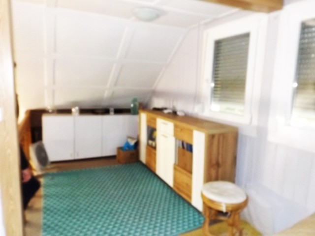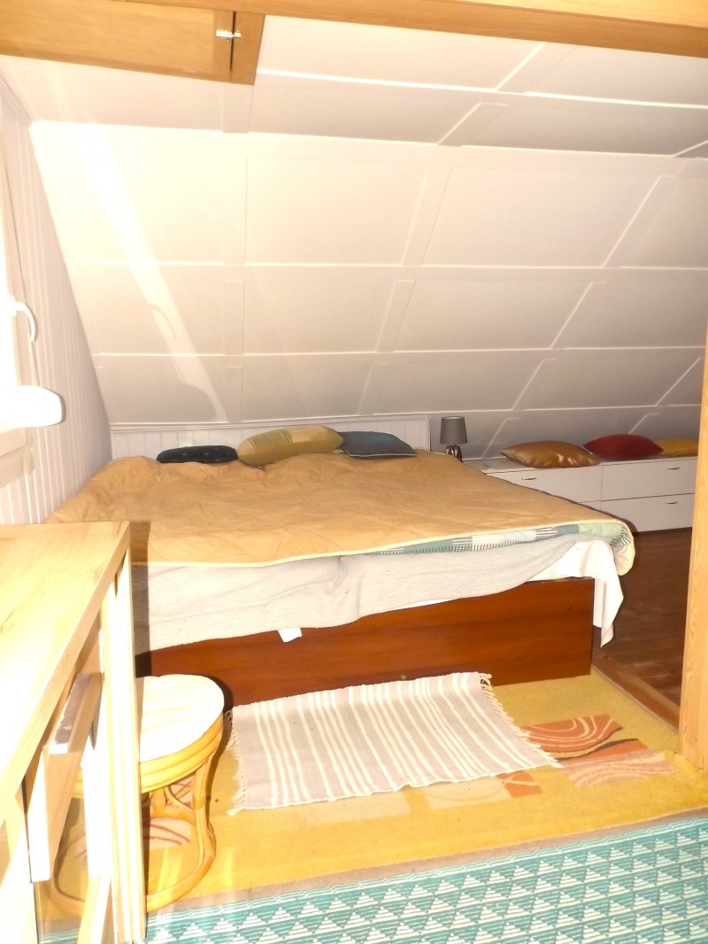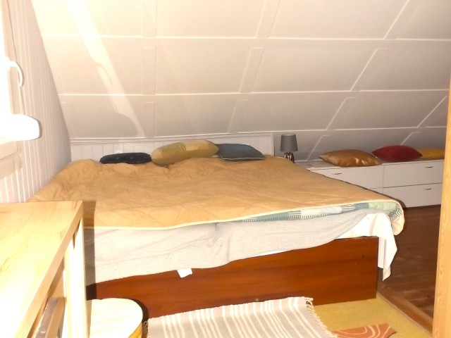 A tetőtérben egy igazán tágas hálószoba kapott helyet, ahol a ház csendes, hegyvidéki környezete különösen nyugodt, pihentető atmoszférát teremt.