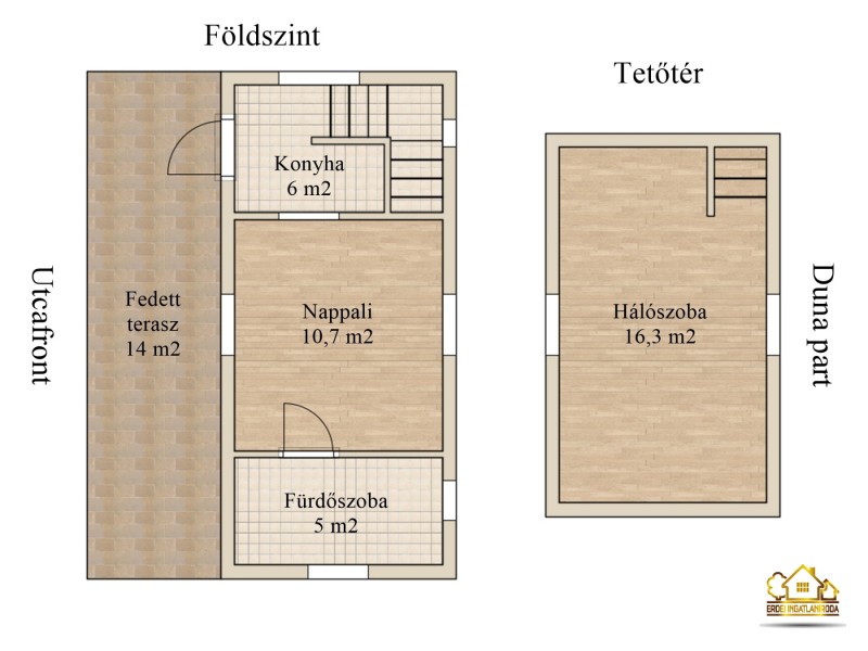 A nappali parkettázott, a konyha és a fürdőszoba járólapozott, a tetőtéri hálószoba fa padlóburkolatot kapott.