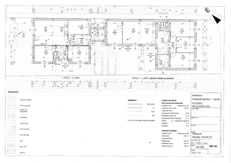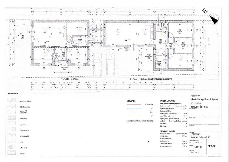 Az 1. lakás lakóterülete 92,35 m2, melyben előszoba (8,95 m2), nappali (24,02 m2), konyha-étkező (12,82 m2), közlekedő (2,80 m2), 1. szoba (12,14 m2), 2. szoba (9,22 m2), 3. szoba (12,17), fürdőszoba (5,08 m2), WC (3,49 m2), és gépészet (1,66 m2) található, valamint egy fedett terasz (7,69 m2) van a bejárat előtt.