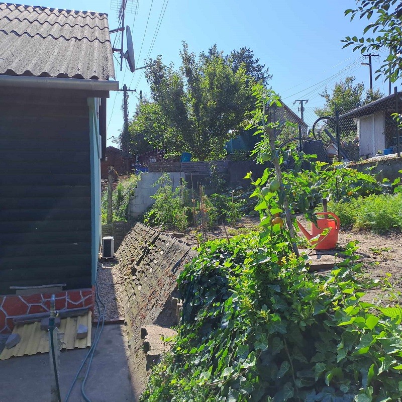 A kert fűvel, veteményessel van beültetve és egy tároló is helyet kapott.