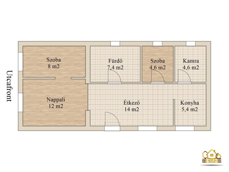 Az ingatlanban egy tágas nappali, 2 félszoba, nyitott konyha, spájz és tusolós fürdő egyben a toalettel kapott helyet.