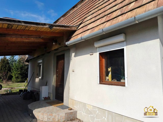 A ház szigetelt, tágas 1054 m2-es ápolt kert, viacolor fedett autóbeállóval, tolóajtós kapuval.