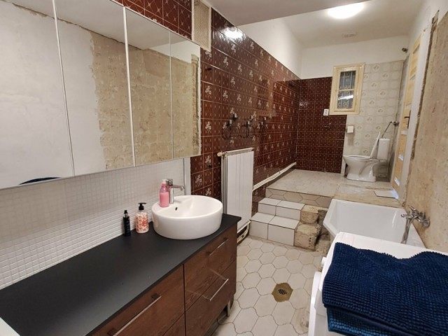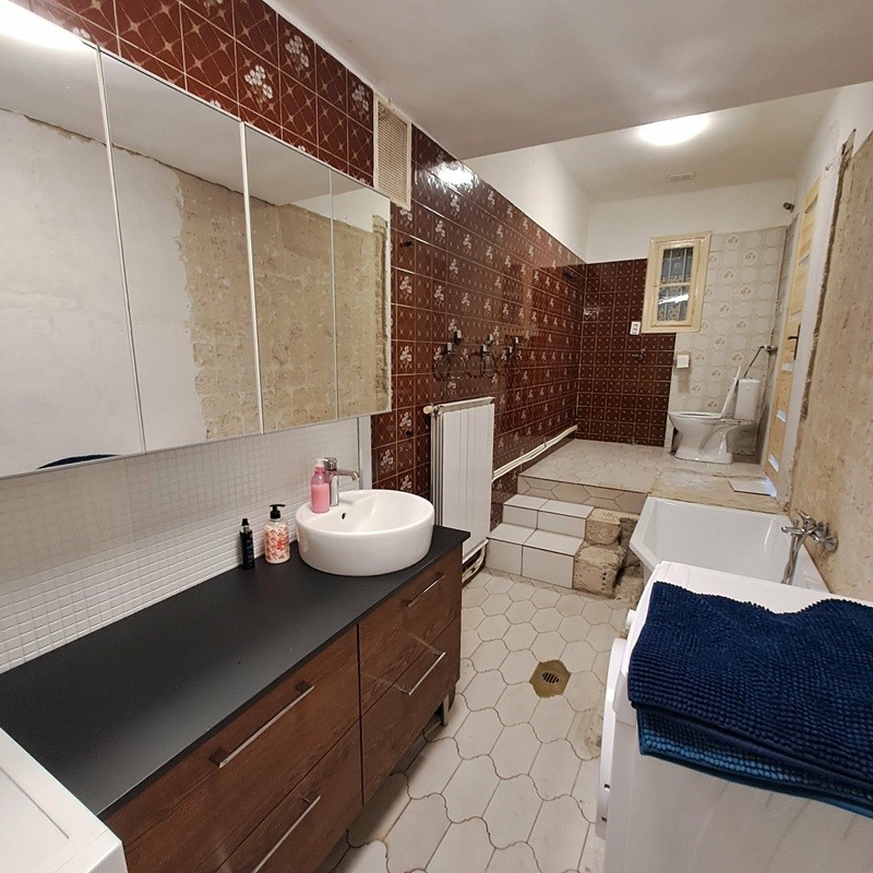 A fürdőszobában a szerelvények újak, de a burkolatokat még nem cserélték ki.
