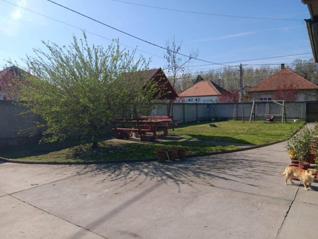 Az udvar egy része térkövezve van, a másik része parkosított, itt található egy szaletli is.