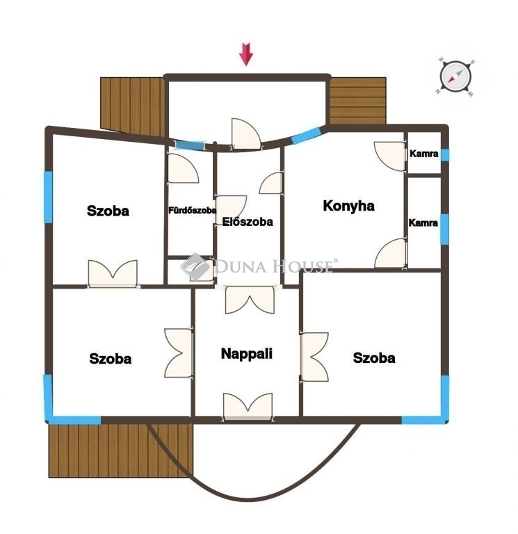 Belépve a főbejáraton balra nyílik a konyha-étkező, s abból egy kamra és tároló.Jobbra található a wc-s fürdőszoba. A közlekedőből nyílik az erkélykapcsolatos nappali, s ebből nyílnak balra és jobbra a hálószobák.