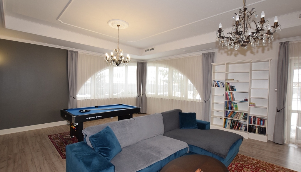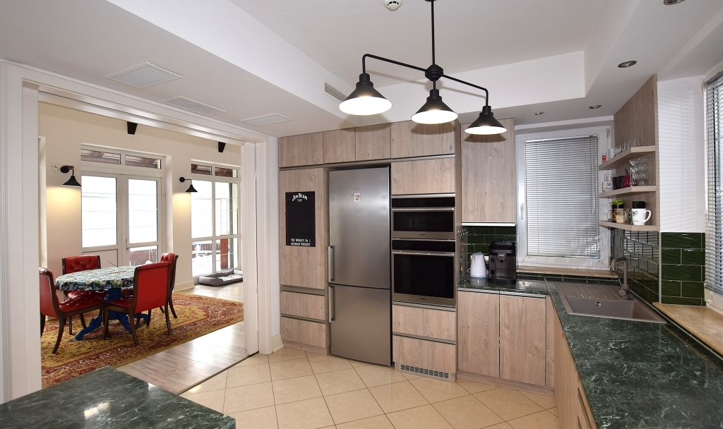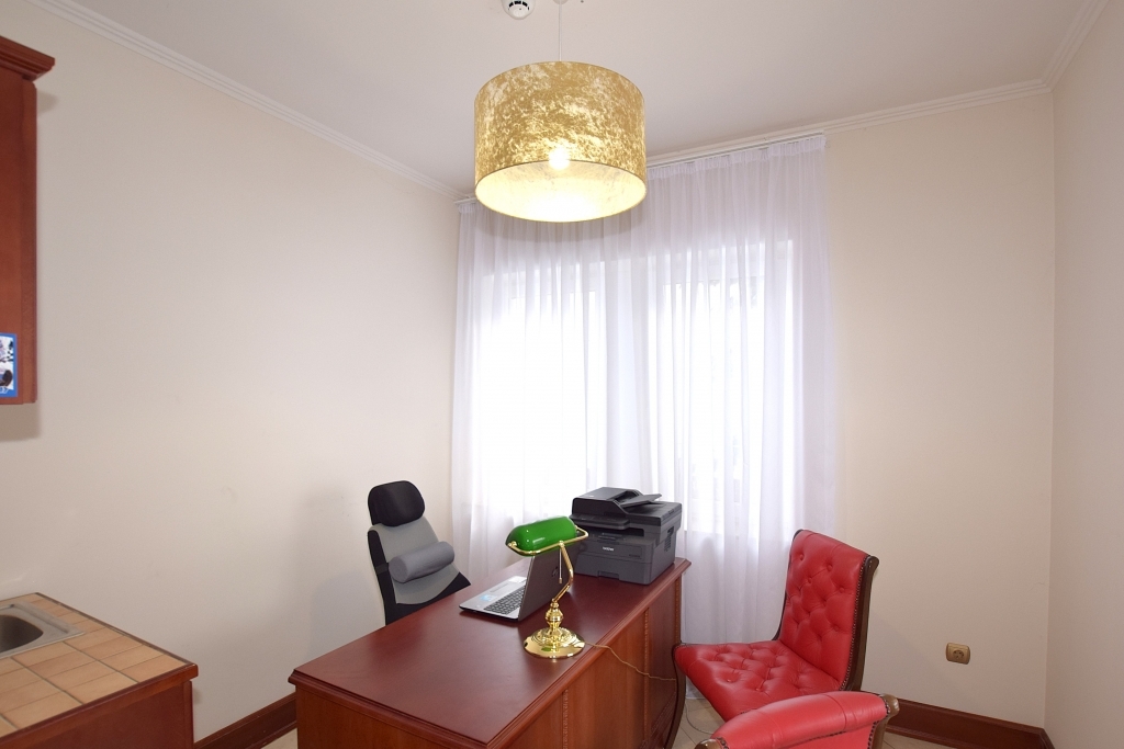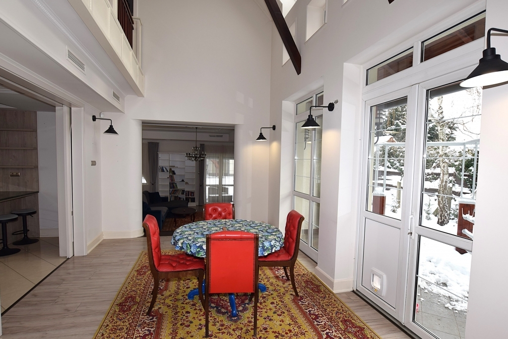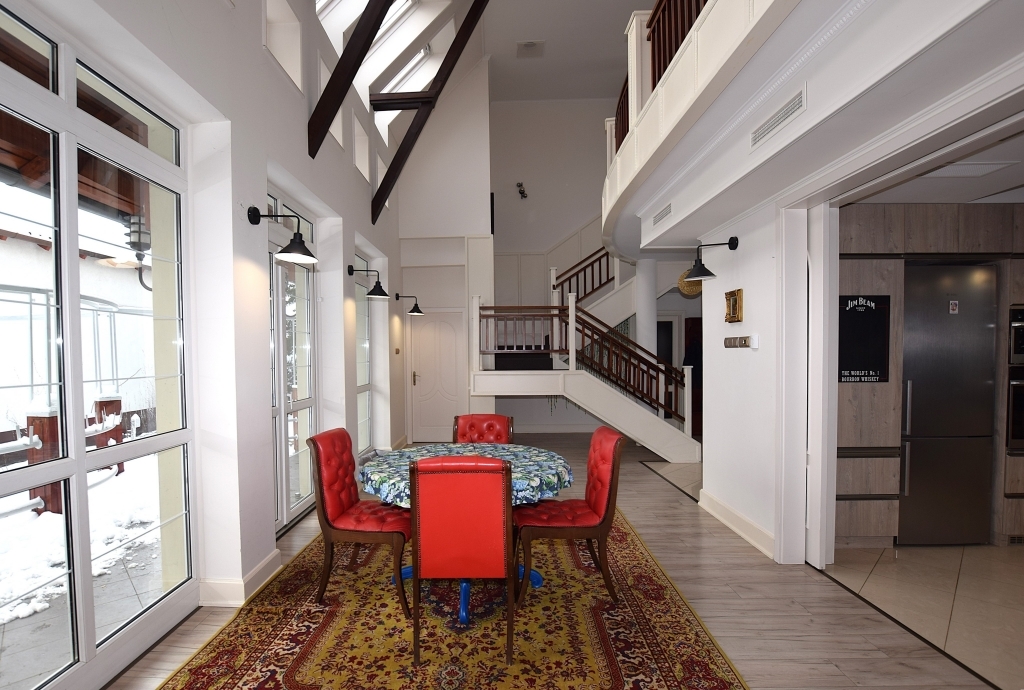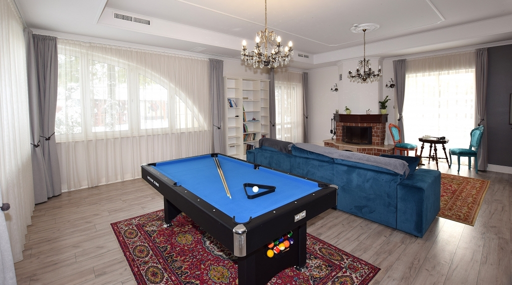 Földszinten található egy tágas nappali kandallóval, biliárdasztallal. Hatalmas étkező-konyha, mely elszeparálható igény szerint. A nappalin kívül van egy szintén tágas szivarszoba, mely használható társalgónak, irodának egyaránt vagy éppen egy külön lakrésznek is.