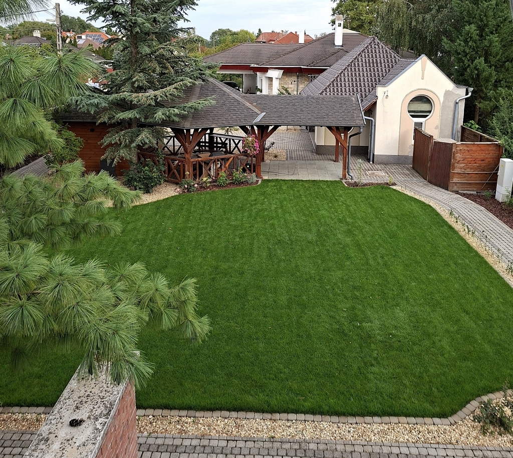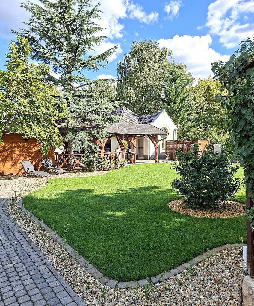 Az udvar öntözőrendszerrel felszerelt, így a sok örökzöld, virág, fű minimális karbantartást igényel. 10-15 növényeket, fákat megvilágító kerti lámpák az esti kerti sétákhoz. Sziklakert és vízköpő egyik és másik végén az udvarnak, hogy garantált legyen a kerti öröm. A kinti grillezőn, sütni kedvelőknek fedett főző rész füstkivezető üsttel. A dupla garázsban (50nm) wc, praktikus monolit födém jó belmagasság padlástér plusz tárolási lehetőség.