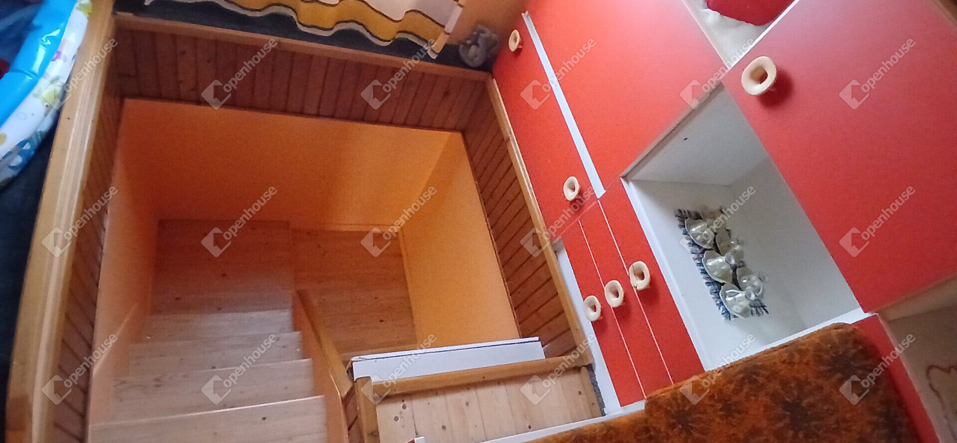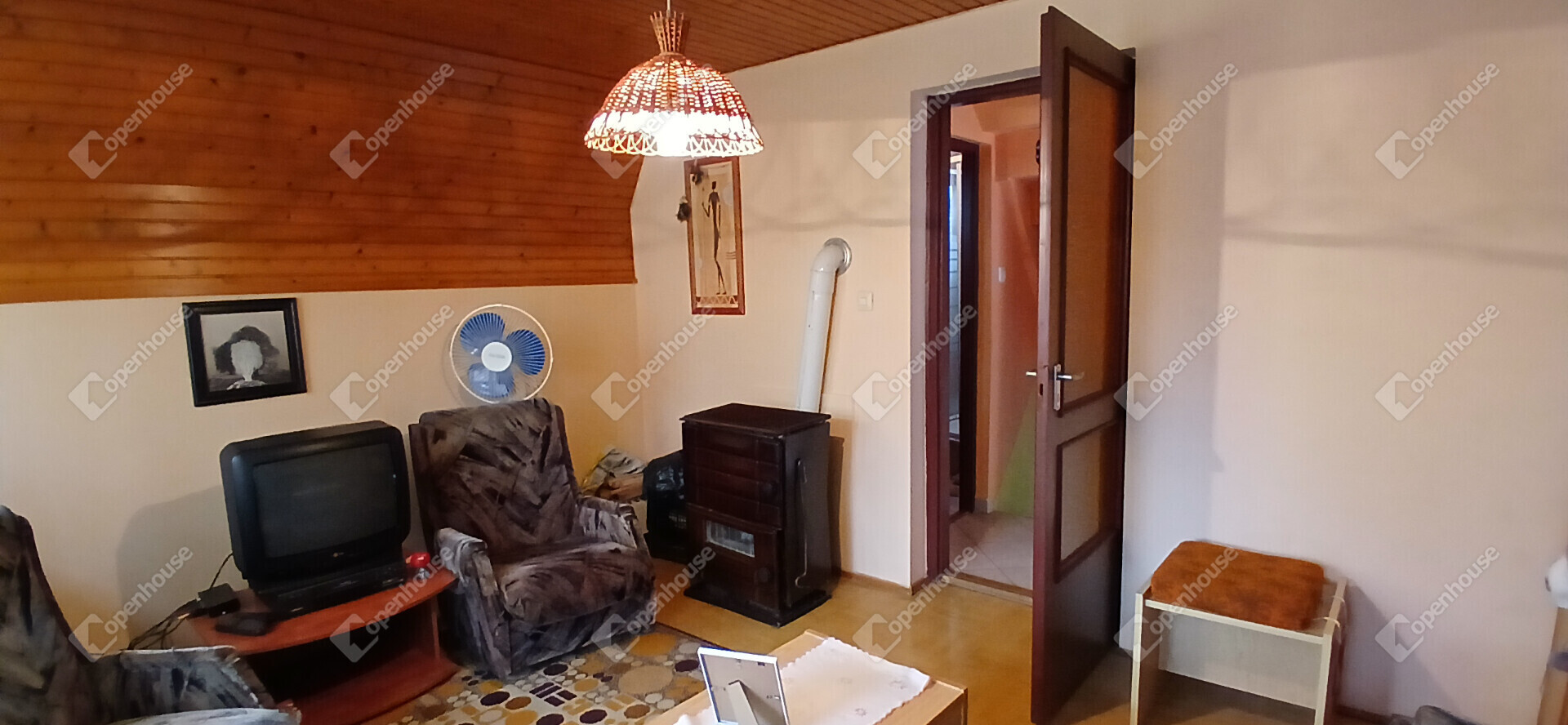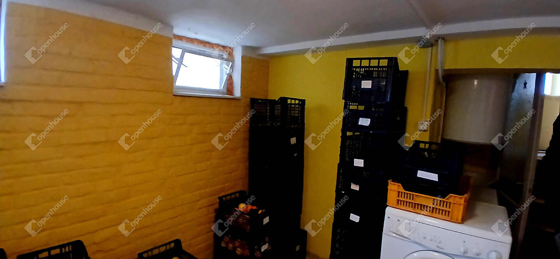 Az ingatlan belső elrendezése praktikus és jól átgondolt. Az alsó szinten egy szoba, egy tágas, egy légtérben kialakított nappali–étkező, főzőfülke, lépcsőház, valamint fürdőszoba WC-vel található. A lépcsőn keresztül megközelíthető az emelet, ahol egy különálló szoba kapott helyet, illetve innen lehet lejárni a pincébe is, ahol egy konyha és egy tároló helyiség található.