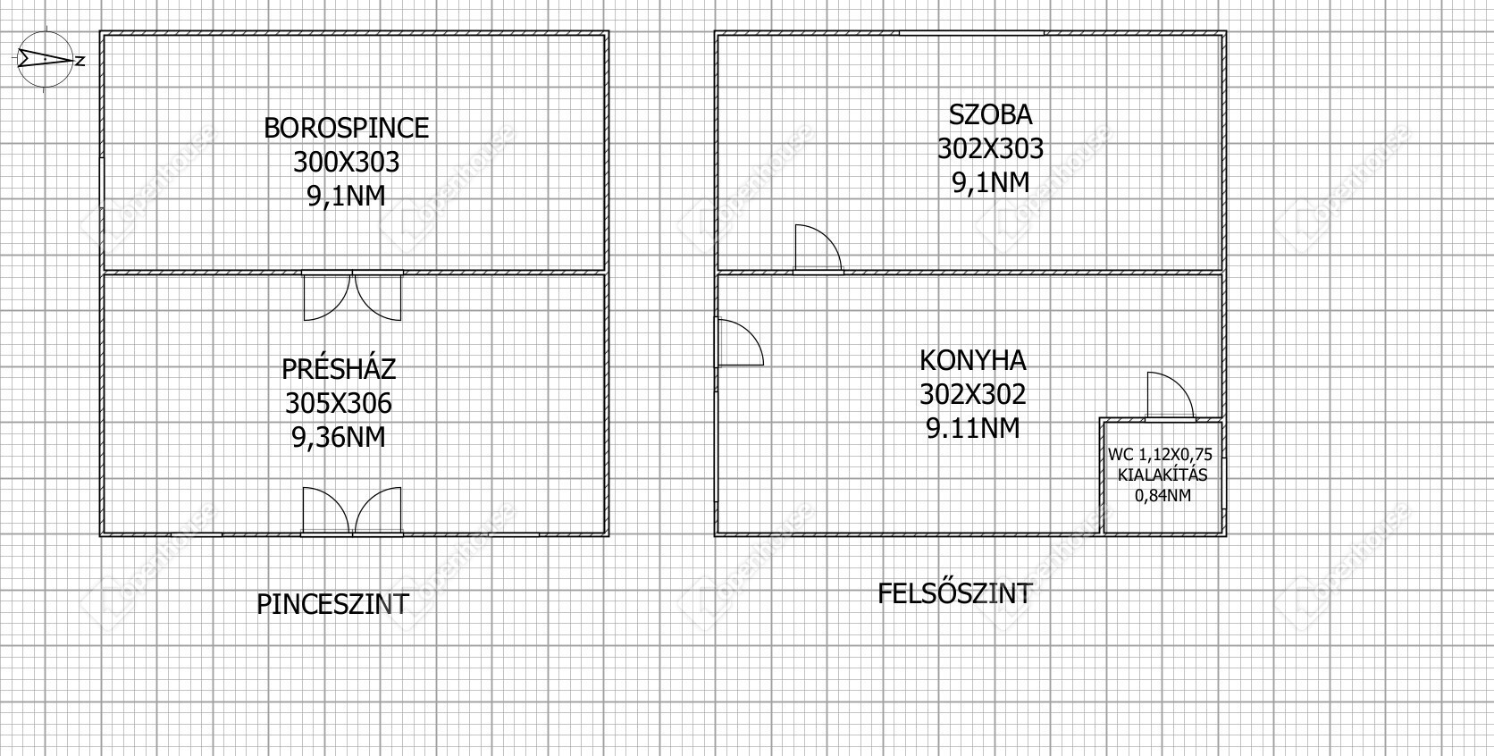 felső szint: szoba, konyha, valamint egy kialakított helyiség (tervezett WC – jelenleg tároló)