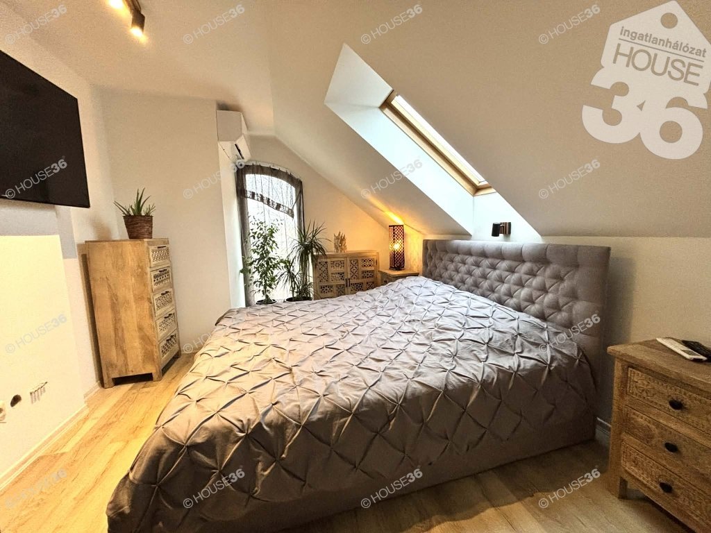 A ház igazi értéke a hangulata: látszó fa gerendák, bontott tégla részletek és egy kemence teszik otthonossá és egyedivé.