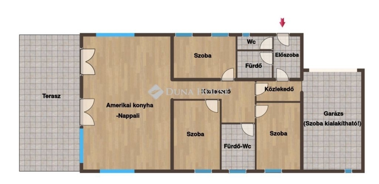 Tágas amerikai konyhás nappali + 3 külön nyíló szobából áll