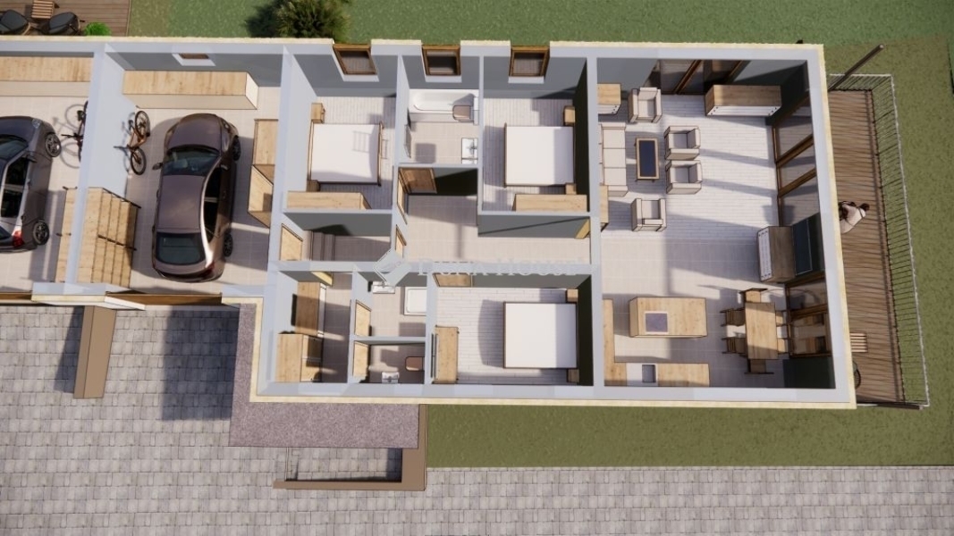 Valamint egy 28 nm-es, önálló garázs, amely igény szerint akár plusz szobává is átalakítható (a teljes alapterületbe beleszámít)