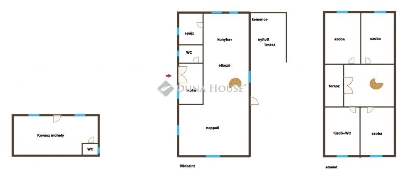 - földszinten: amerikai konyhás nappali, kamra, előtér, WC, nyitott teraszon: búbos