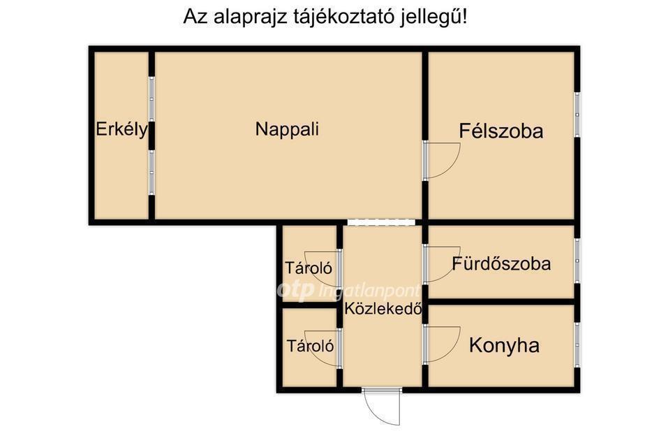 - Elosztása: egy tágas szoba erkéllyel, félszoba, konyha, fürdőszoba és WC egy helyiségben, előszoba, két külön bejárattal tároló