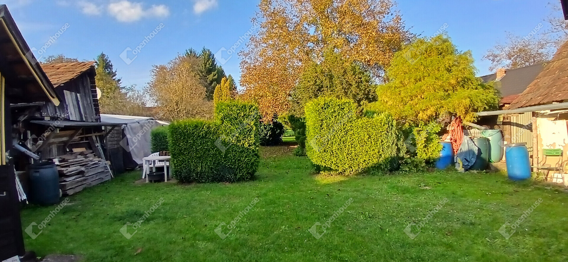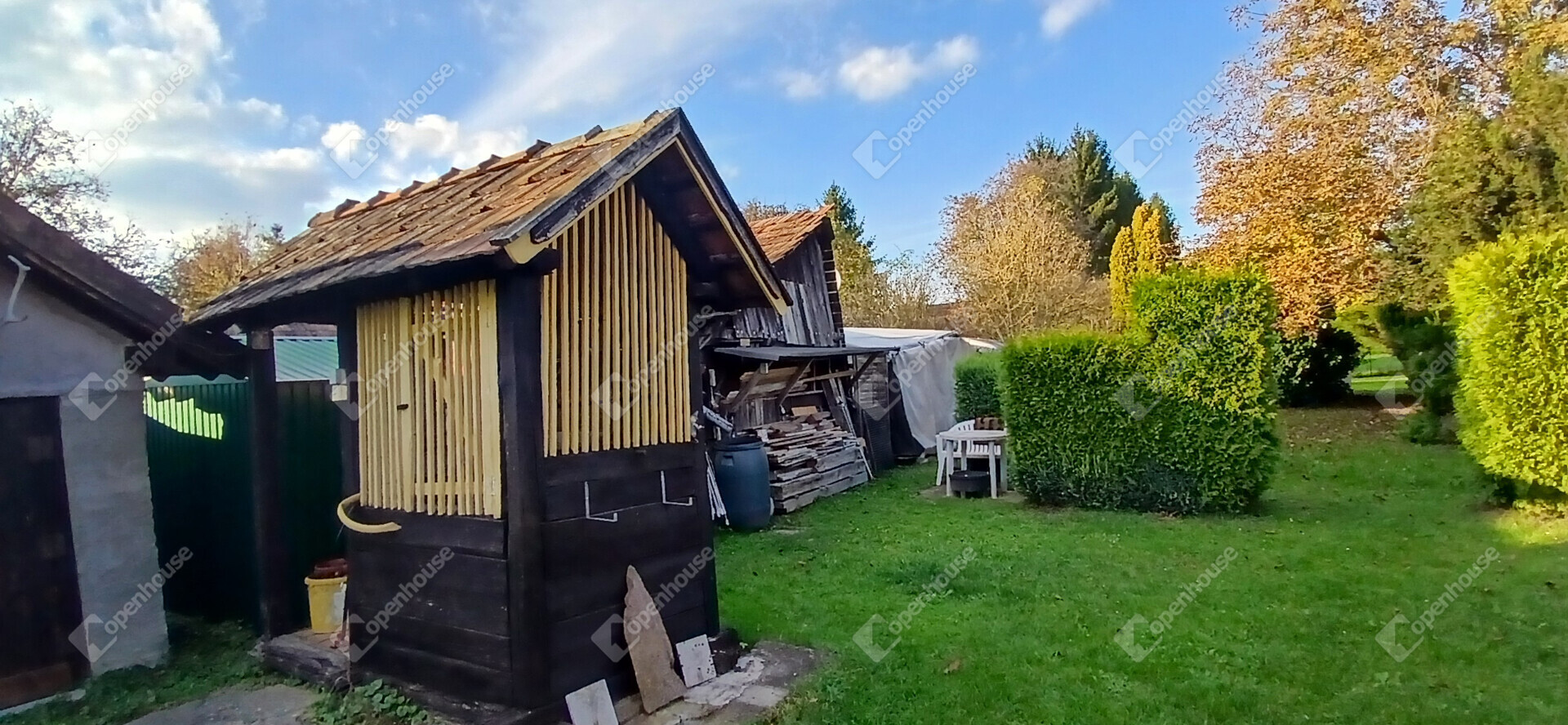 A telken 2914 négyzetméternyi terület áll rendelkezésre, amelyen több tároló, barkácsműhely és egy három beállós kocsibeálló is megtalálható. A kert rendezett és gondozott, így akár azonnal használható, de bőven ad lehetőséget a további szépítésre is. A telken egy ásott kút is található, amely szivattyúval van ellátva, így kiválóan alkalmas a kerti öntözéshez.