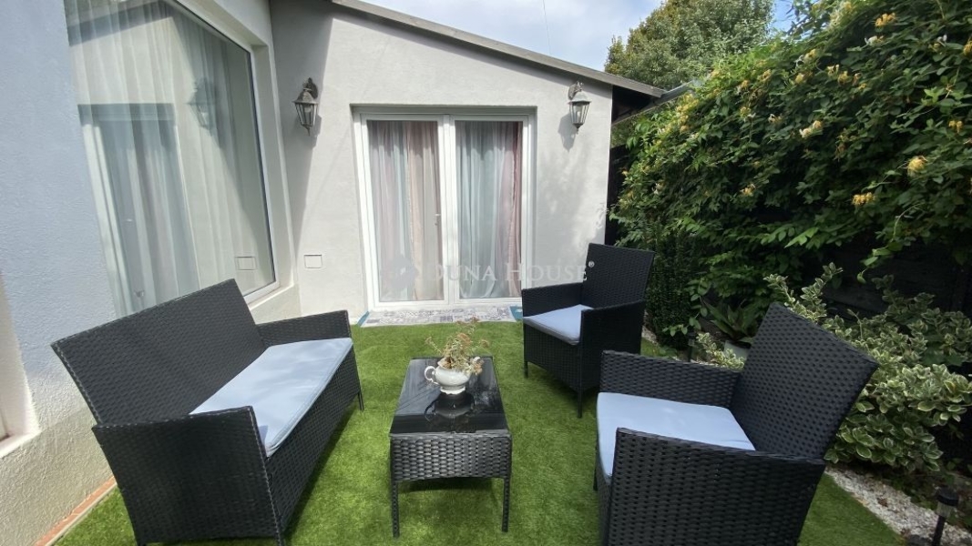 A telek végében saját tágas kert biztosít lehetőséget pihenésre, az udvaron pedig a házhoz tartozó fáskamra és nyári konyha ad plusz tárolási lehetőséget.