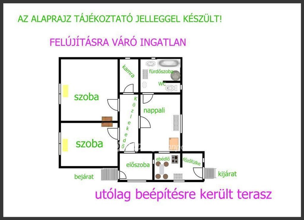 Külön nyíló szobák, előszoba beépítésre került a terasz étkező főzőfülke, nem szerepel a térképen, közlekedő nappali, kamra fürdőszoba Wc helységei.