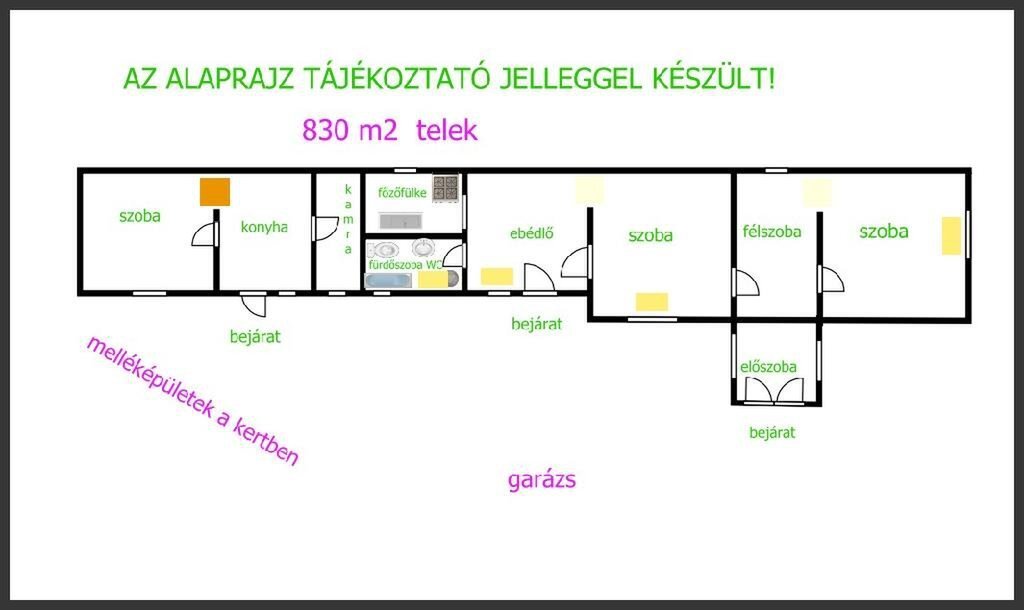 A kert 830 m2, udvaron található egy 30 m2-es garázs és melléképületek bontandó vagy komoly felújítást igényelőek.