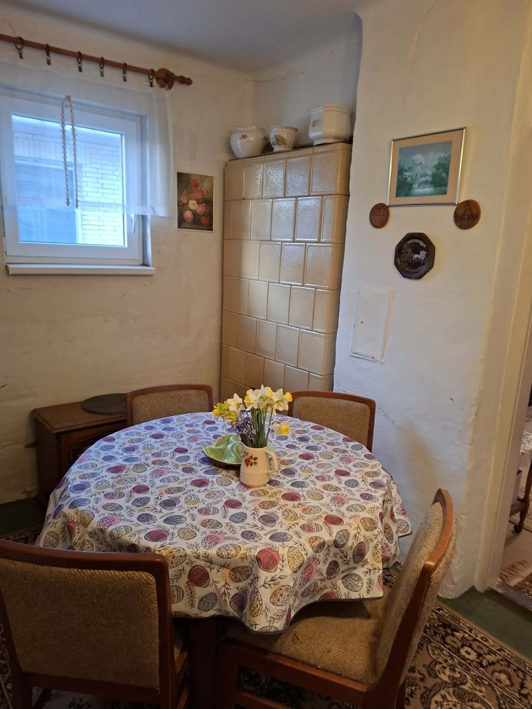 Fűtése beépített gyönyörű cserépkályha, konvektoros.