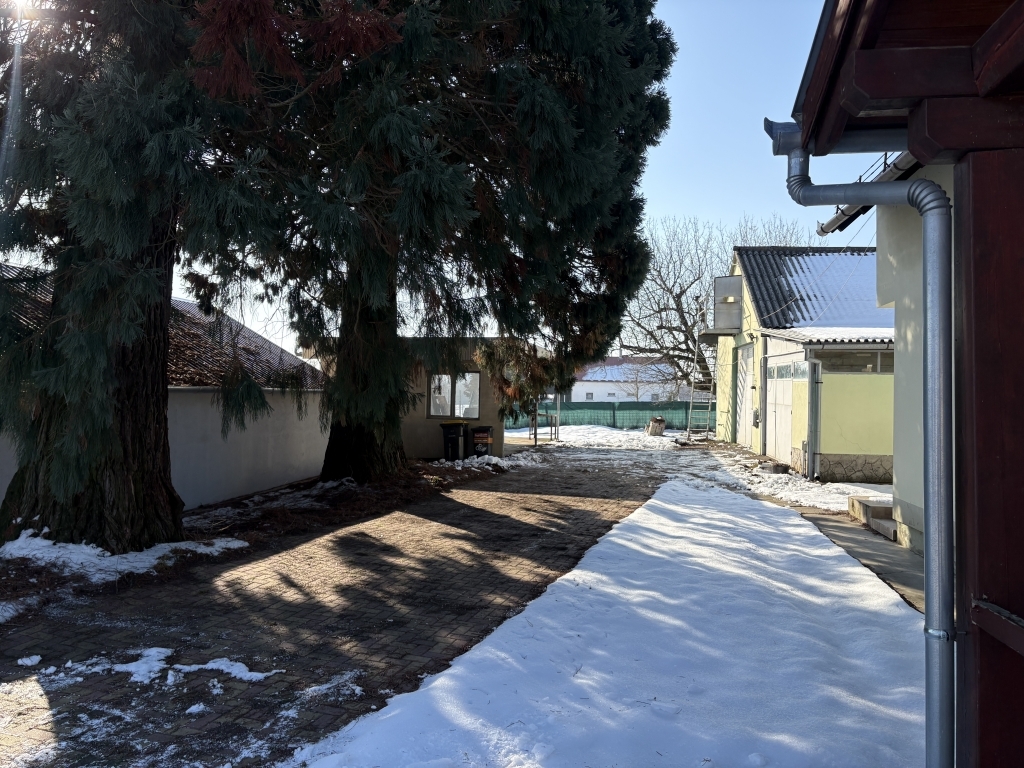 A tágas, térkövezett udvar kényelmes parkolást és sokoldalú kihasználhatóságot biztosít.
