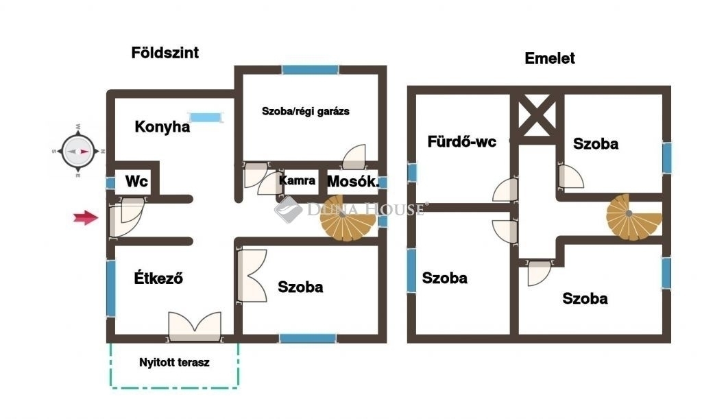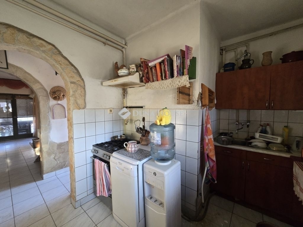Az alsó szinten konyha, étkező és nappali biztosítja a közös életteret, emellett kamra, külön WC, mosókonyha, valamint egy fűtött helyiség is található, amely korábban garázsként funkcionált.