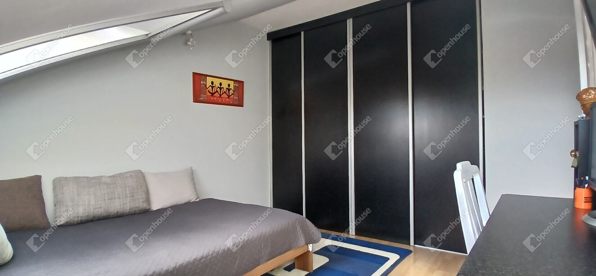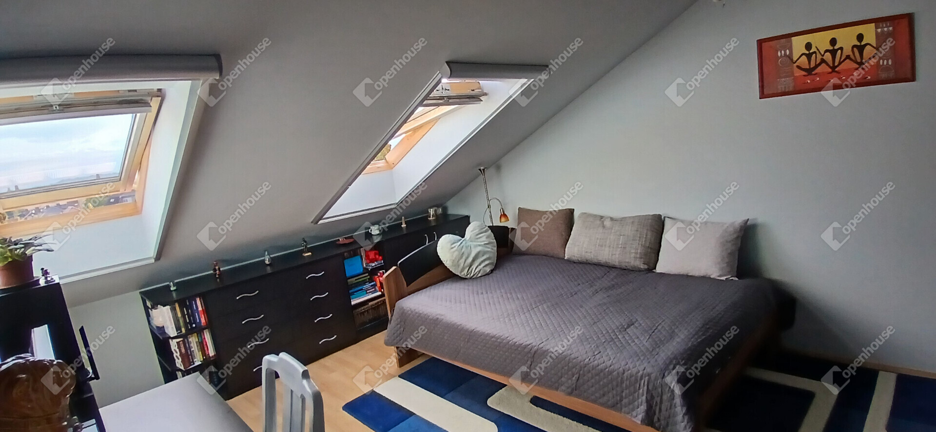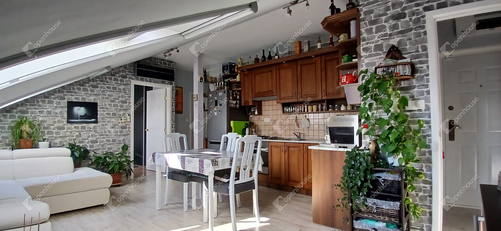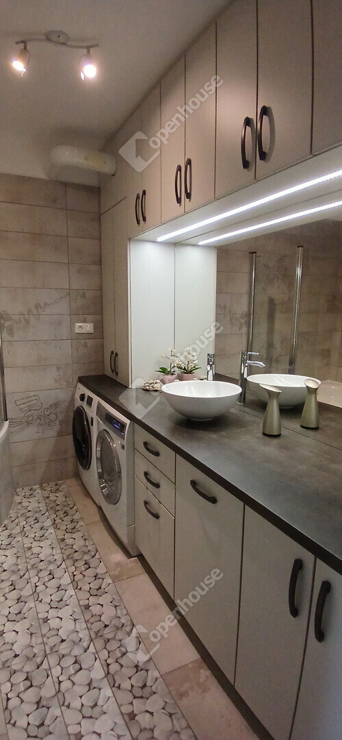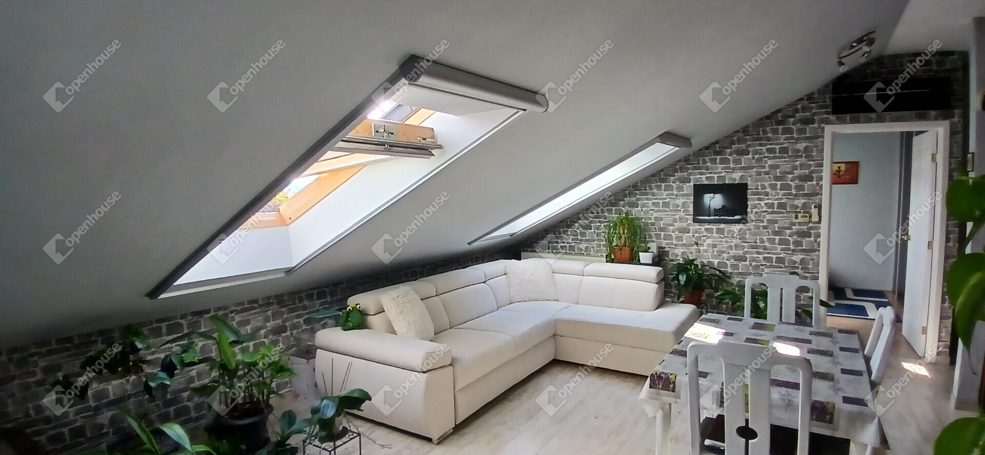 A nappali és a konyha egy tágas, amerikai stílusú térben egyesül – ideális helyszín a közös vacsorákhoz, filmnézésekhez vagy csak egy nyugodt kávéhoz a reggeli napsütésben. Két nagy méretű hálószoba, egy sarokkádas fürdőszoba és egy külön WC teszi teljessé az elrendezést. A tetőtér adottságait ötletesen használták ki: minden beépített bútor egyedi, méretre készült, így minden négyzetméter tökéletesen kihasznált.