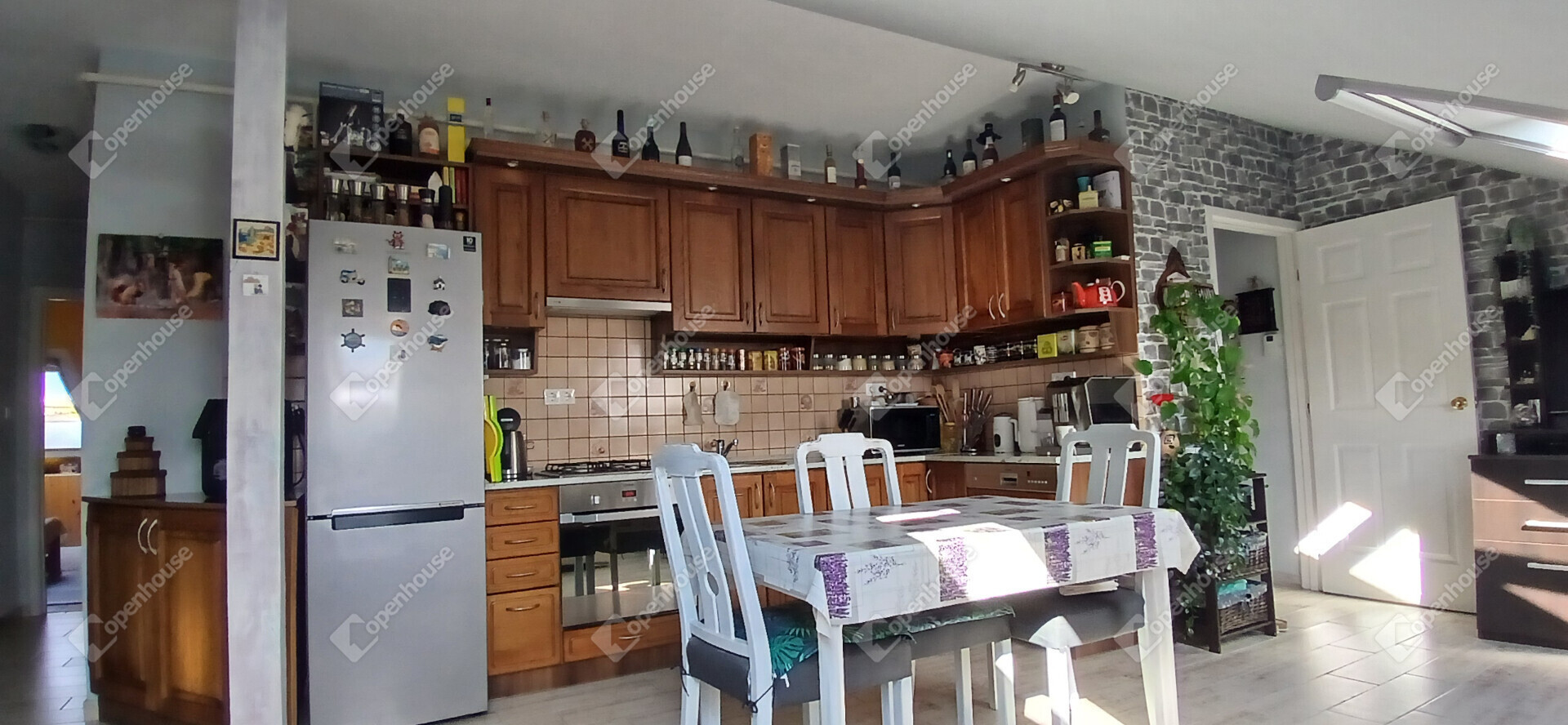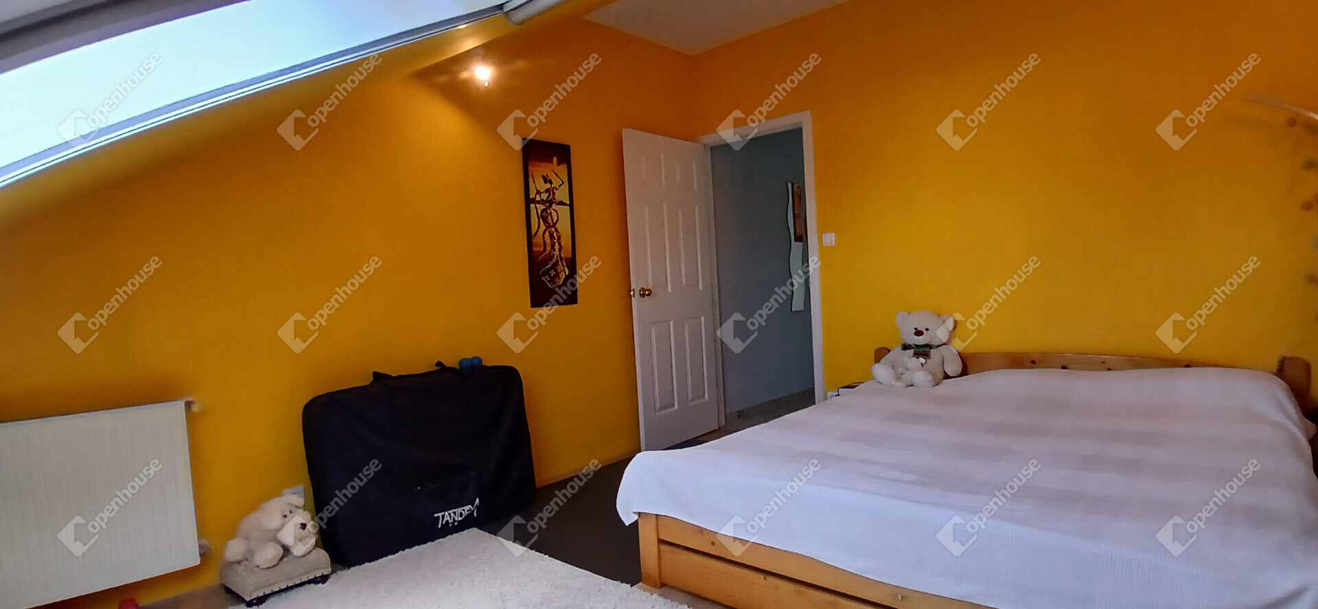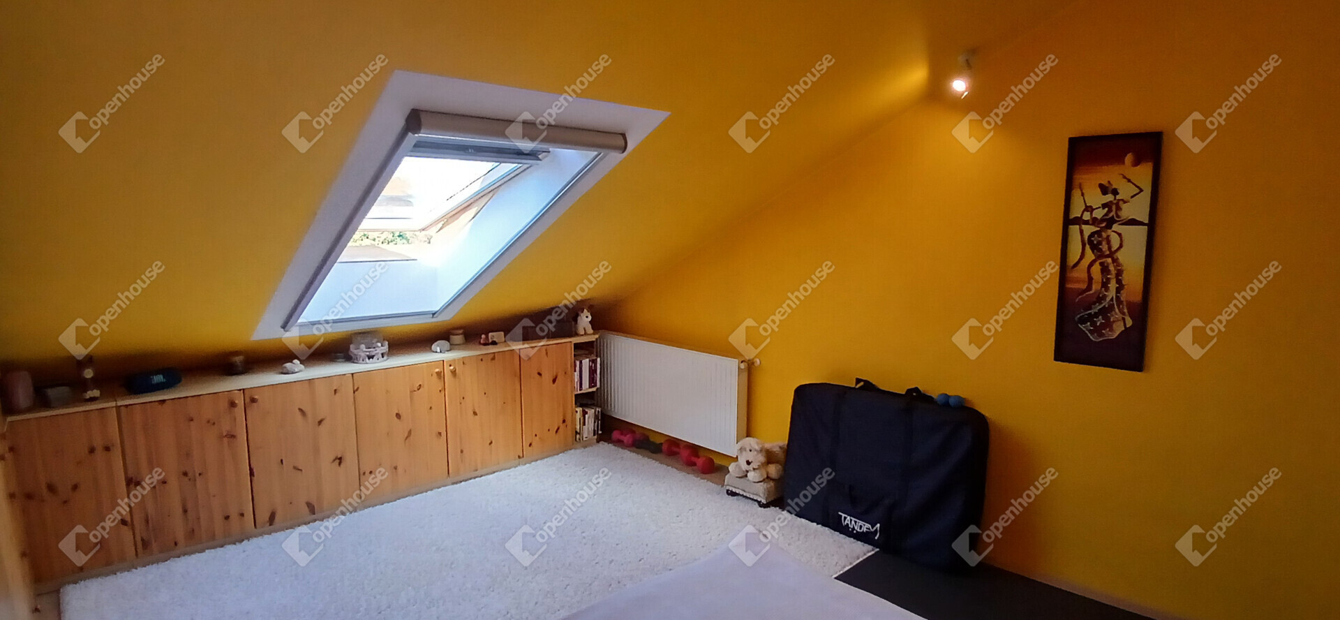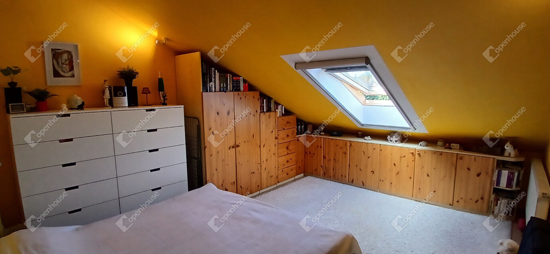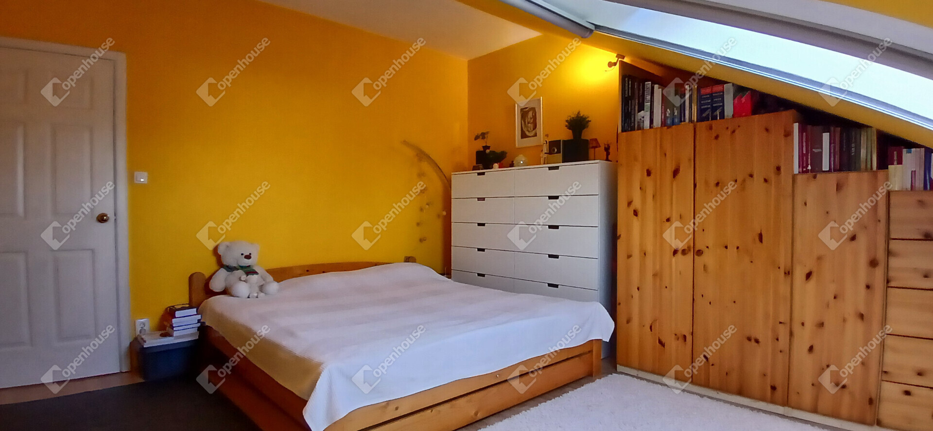 A nappali és a konyha egy tágas, amerikai stílusú térben egyesül – ideális helyszín a közös vacsorákhoz, filmnézésekhez vagy csak egy nyugodt kávéhoz a reggeli napsütésben. Két nagy méretű hálószoba, egy sarokkádas fürdőszoba és egy külön WC teszi teljessé az elrendezést. A tetőtér adottságait ötletesen használták ki: minden beépített bútor egyedi, méretre készült, így minden négyzetméter tökéletesen kihasznált.