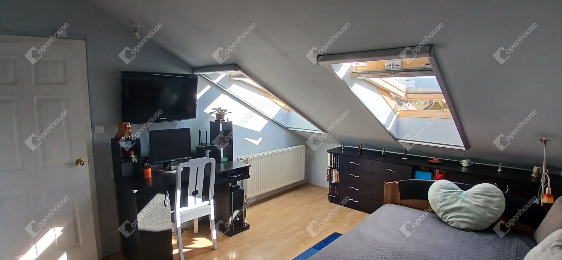 háromrétegű, hő- és hangszigetelt Velux ablakok, hővédő rolóval és szúnyoghálóval