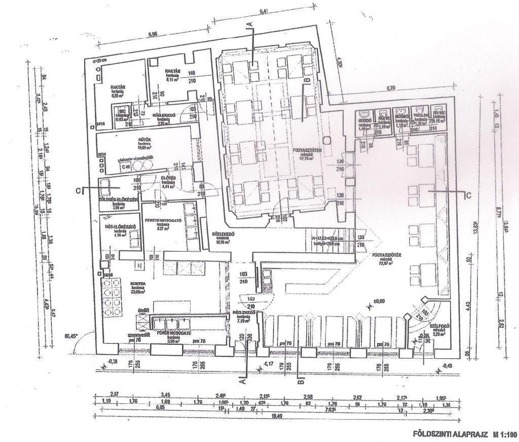 A földszinten éttermi konyha található a hozzá tartozó kiszolgáló helyiségekkel, két vendégtérrel, melyek 80 fő befogadására alkalmasak (240 m2).
