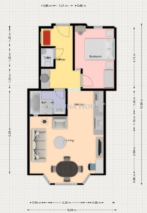Az 55 m²-es lakás átgondolt elrendezésű: amerikai konyhás nappali teljesen gépesített konyhával, külön hálószoba, kádas és walk-in zuhanyos fürdőszoba, külön toalett mosdóval és bidé zuhannyal, valamint tolóajtós, mennyezetig érő gardrób kapott helyet. A mosó- és szárítógép számára külön kialakított tároló áll rendelkezésre.